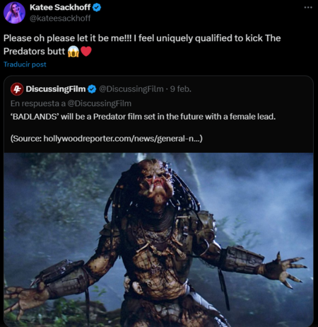Mediante una publicación en redes sociales la actriz dice que por favor la dejen participar en el proyecto, que le encantaría darle una paliza al famoso cazador. Esto en respuesta a otra publicación donde se da a conocer que el nombre de la nueva película será “Depredador Badlands” y que tendrá a una mujer como protagonista.