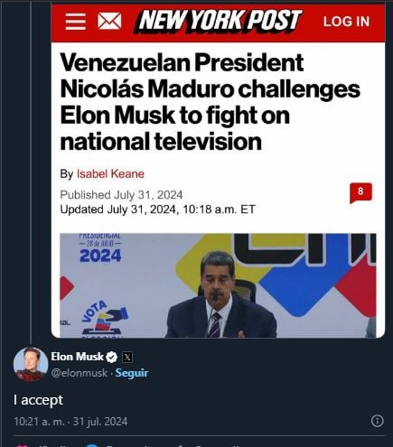 Para finalizar está locura, Elon Musk está seguro de que ganará el combate y no por ser más fuerte, dice que Maduro terminará acobárdense y cancelando el encuentro. Es impresionante ver cómo mientras Venezuela está en un momento crítico su actual gobernante se está peleando en redes sociales con una figura pública como lo es Musk quien es conocido de causar numerosas polémicas solo para llamar la atención