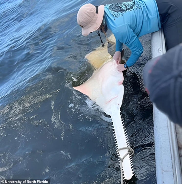 Este descubrimiento ocurrió mientras un equipo de la Universidad del Norte de Florida exploraba el río St. Mary’s, que atraviesa Florida y Georgia. Un miembro del equipo sintió como una de las líneas de pesca se tensaba y llamó al profesor encargado de la exploración. Resulta que pescaron un “tesoro” histórico y biológico pues lo que salió del agua fue un pez sierra de unos 3 metros de largo.