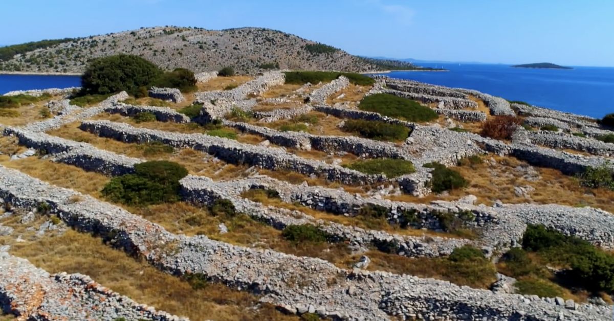 Este curioso territorio se encuentra frente a la costa croata, en el archipiélago de Šibenik y cuenta con una extensión de 0.14 km. cuadrados, lo que la clasifica como una “Isla pequeña”. Como dijimos al inicio está singular forma es obra humana pues varias agricultores y granjeros levantaron muros de piedra de una forma estratégica para que desde el aire diera la impresión de ser una huella.