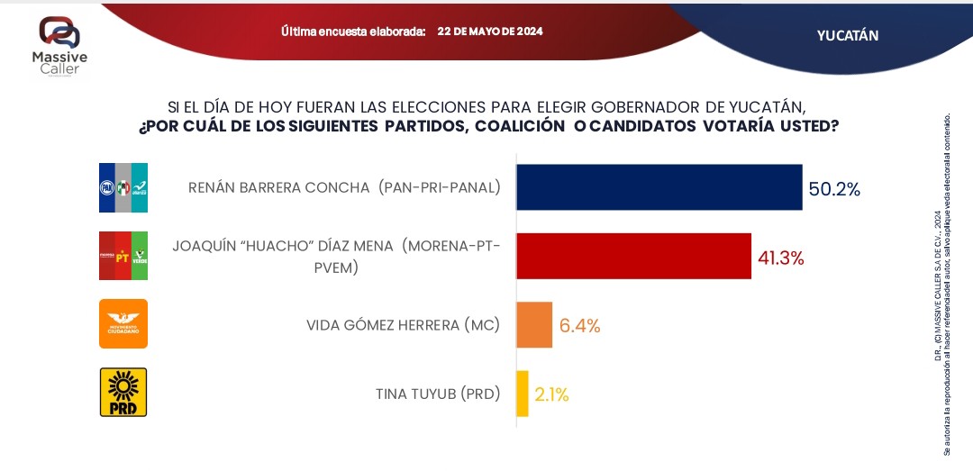 Cabe destacar que el método que se use para realizar las encuestas , dan el triunfo por la diferencia de 10 puntos a Renán Barrera, sobre su más cercano competidor, Massive Caller, es por vía telefónica  a hogares y Segmentos Research, por levantamiento personalizado en campo.