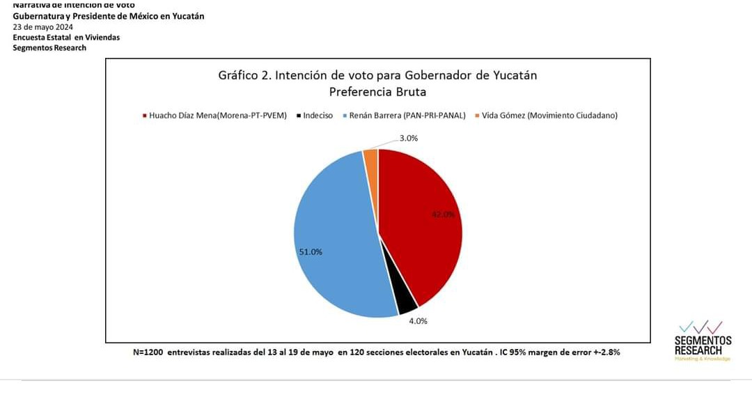 Por su parte, la empresa Segmentos Research también confirmó la ventaja de Barrera Concha en sus estudios. De acuerdo con sus datos, el candidato lidera con un 51 por ciento de las intenciones de voto, frente al 42 por ciento que obtiene Díaz Mena. Estos resultados reflejan una tendencia consistente a lo largo de las últimas semanas, consolidando la posición de Renán Barrera Concha como el favorito en la carrera electoral. La encuesta de Segmentos Research también destaca la capacidad de Barrera Concha para mantener un alto nivel de apoyo en diferentes sectores de la población, lo que refuerza su perfil como un candidato inclusivo y comprometido con diversos grupos de la sociedad.